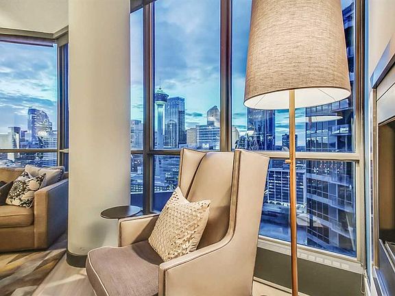 This renovated sub-penthouse at Keynote One delivers. Towering above the city, executive living showcases panoramic views of the Rocky Mountains and glittering downtown skyline. This address isn’t just central—it’s strategic. With the highly anticipated Calgary Ice District on the horizon, you’re not only investing in a luxury home, you’re investing in the city’s future. Positioned steps from the Saddledome and Stampede Park, this location is set to become the beating heart of Calgary’s sports, entertainment, and culture scene—a world-class hub that will elevate property values and prestige for years to come. The WOW starts at the front entry when you are struck by the 10-foot ceilings and floor-to-ceiling windows with massive spans of glass - the views command attention. Herringbone floors flow through a sleek layout with 2 bedrooms, 2 bathrooms, and a versatile den. The nearly 20-foot balcony offers front-row seats to mountain sunsets and city lights, perfect for entertaining or unwinding. The chef’s kitchen is bold and functional, with Café appliances, bronze hardware, quartz waterfall counters, and a walk-in pantry upgraded with custom California Closets shelving.Perched at the edge of the building, the primary suite is a sanctuary of privacy and calm. Encased in concrete with no neighbours on either side, it offers unrivalled quiet. Imagine sinking into bed, the fireplace glowing beside you, as the lights of the Calgary Tower twinkle in the distance—a nightly view reserved only for the few at the top. The ensuite is clad in rich limestone with a private water closet, and the custom walk-in closet—designed by California Closets—provides the organization and polish you’d expect at this level. More than four walls—it comes with a lifestyle amenities including Sunterra Market and Market Bar at your doorstep, a professional fitness center and cardio room, guest suites for visitors, and direct access to the +15 network, river pathways, and the city’s expanding core. One Titled "Rock-Star" parking stall and storage locker came come with this purchase and additional parking is available for rent.