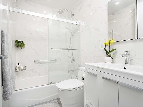 The interiors showcase a meticulous renovation: a spacious kitchen with quartz countertops, marble subway tile backsplash, stainless steel appliances, and abundant cabinetry. The spa-like bath offers Grohe fixtures, a soaking tub with glass enclosure protected by easy-clean nano-coating, and elegant finishes. The bedroom accommodates a king-size bed, includes a walk-in closet, extra large window, and a remote-controlled Lutron blackout shade. Thoughtful upgrades include recessed lighting, Lutron dimmers and outlets, remote-controlled bedroom shade and lighting, seamless TV wiring, and freshly painted, immaculate interiors.