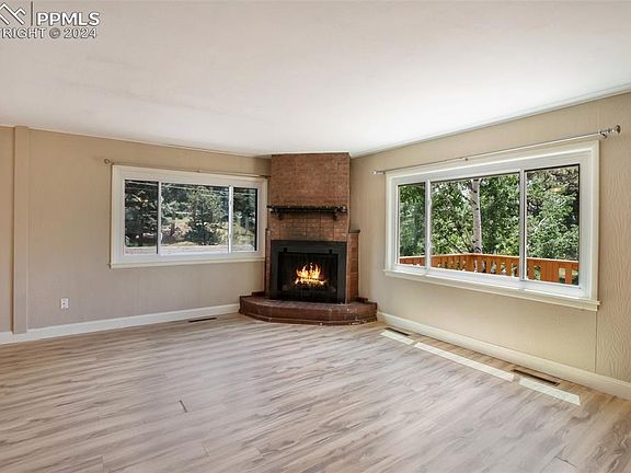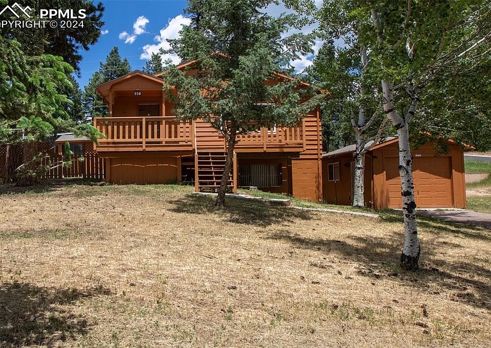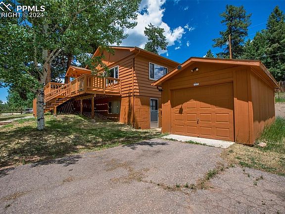 Lovely mountain home on a large corner lot in the beautiful town of Woodland Park. This home sits on .32 acres with mature trees, two fenced in areas, storage shed, a detached 1 car garage, as well as an attached 1 car garage. Located in the heart of Woodland Park this property is a very short distance to Memorial Park, food, shopping, and schools. This property not only offers a large yard, but a large deck facing south with views of Pikes Peak. As you enter the upper level of the home, you will find a spacious living room with wood laminate flooring with adjoing dining room and large kitchen with large breakfast bar. There are lots of windows that bring in tons of natural light and there is a wonderful wood fireplace to keep you warm during the winter months. The kitchen offers lots of counter space and cabinet storage, as well as a lovely garden window above the kitchen sink that looks out onto the backyard, you will also find a walkout to the backyard from the kitchen where you can access the storage shed. Also located on the main level you will find the master bedroom, additional bedroom, and full bathroom with two sinks, ample counter space, and shower/tub combo. As you make your way downstairs, you will find the large laundry room/ utility room, with lots of shelving for storage, access to the attached garage with tons of extra storage space, and access to the lower level living area. You will find that this separate area not only has its own living room, bedroom, and 3/4 bathroom, but its own kitchen as well, with a walk-out that leads to the additional detached garage. This home is certainly one of a kind, with numerous possibilities. This property would make a great investment!