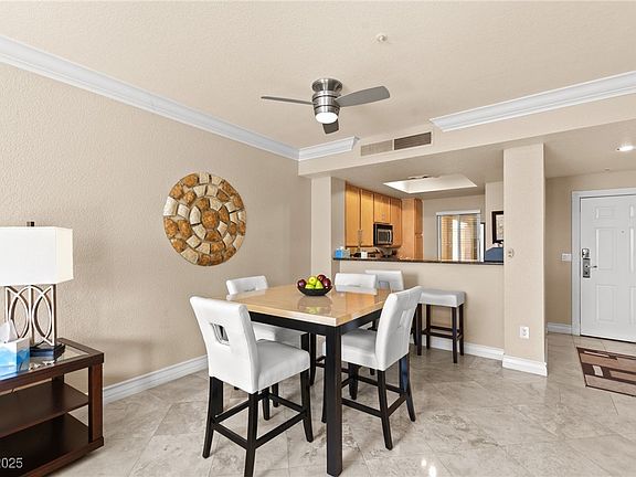 Experience resort-style living in this beautifully maintained 2 bedroom, 2 bathroom condo just minutes from the Las Vegas Strip. This inviting corner unit offers an open-concept layout with crown molding, modern ceiling fans, and polished tile flooring throughout the main areas. The kitchen features granite countertops, stainless steel appliances, and ample cabinet space—perfect for entertaining. The spacious living room opens to a private balcony with tranquil views of the mature landscaping and resort-style pool. The primary suite includes plush carpeting, a large window for natural light, and an ensuite bath with granite counters and a walk-in shower. The secondary bedroom is equally comfortable, with easy a separate full bathroom. Additional highlights include in-unit laundry, furnishings, custom lighting, and a gated entry with secured access. Ideal as a vacation home, investment property, or full-time residence—this condo offers luxury, comfort, and convenience in one.