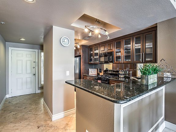 This 2 bedroom 2 bath condo is finished in travertine, granite, and dark wood cabinets with frosted glass front, plush carpet, leather furniture, a private balcony, breakfast bar, fully equipped kitchen with stainless steel appliances, gas range, king size bed, and queen size bed, flat screen TV's, artwork, and washer/dryer.