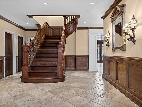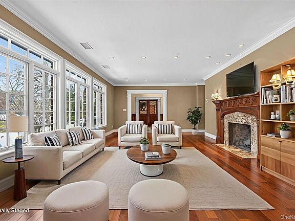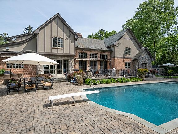 This stately custom-built home offers 5 bedrooms and 4.55 baths, set on a beautifully landscaped shy 1-acre lot. Boasting over 6,000 square feet of elegant living space, this residence seamlessly blends grandeur with comfort. Step into the impressive foyer featuring radiant heated marble floors, a sweeping grand staircase, and soaring cathedral ceilings. The main level includes a formal living room with fireplace, a sophisticated library with fireplace, and a banquet-sized dining room ideal for entertaining. The chef’s kitchen, equipped with top-of-the-line appliances, opens to an expansive family room with fireplace, vaulted ceilings, and French doors leading to your private backyard oasis. A first-floor guest suite offers a full bath, sitting area, and private entrance—perfect for visitors or extended stays. Upstairs, the luxurious primary suite is a true retreat, featuring a spa-like bath with steam shower, claw foot tub, a generous dressing room, and a spacious oversized walk-in closet. Three additional bedrooms complete the second floor—one with an en-suite bath and two sharing a hall bath. The resort-style backyard is an entertainer’s dream with a heated saltwater in-ground pool, built-in BBQ, lush specimen plantings, and multiple entertaining areas—all designed for relaxing and enjoying outdoor living in style.