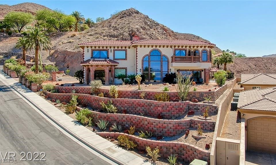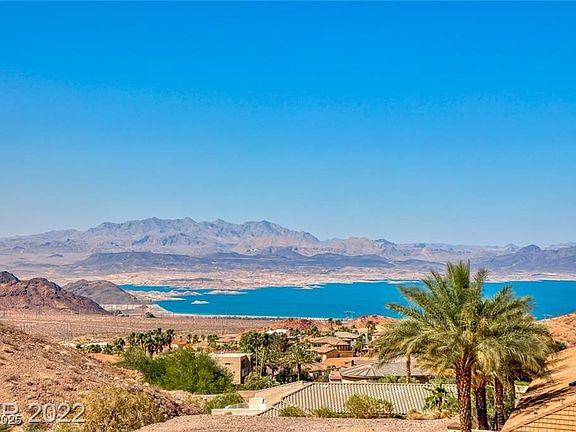 Inspiring, panoramic views of Lake Mead and Mountains! This custom Hillside Mediterranean-style home is located in Lake Mead View Estates, one of Boulder City’s finest neighborhoods, on .46 acres. Foyer has vaulted ceilings opening to formal living room with floor to ceiling windows and fireplace. Hardwood craftsman style windows and doors. Opened kitchen with custom cabinets, SS appliances, huge island, family room, and wet bar. Main floor primary suite with covered patio. Office with built-in book cases. A grand curved staircase. Two large second floor suites with balconies. A large opened recreation room for more lake and mountain views. A quaint brick gazebo and covered patio by the pool. New air conditioned RV garage addition 14’x14’ overhead door 21’ X 44’ w/15’6” ceiling “car stacking capable” attached to 9’x8’ overhead door garage 17’X24’, totaling 1300 sq. ft. Desert friendly gardens with walkways to explore landscape. This is a must see one of a kind elegant luxury home!