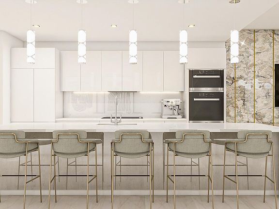 Indoor amenitiesVoluminous ceilingsLuxury waterfront developmentSpa-style bathYoga deckWaterfall quartz islandRooftop lap pool