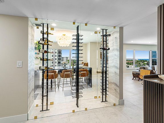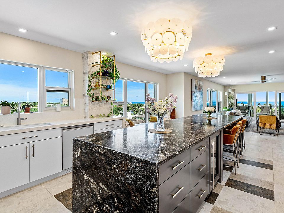 Experience luxury coastal living in this stunning, newly renovated 8th-floor corner unit with breathtaking intracoastal and panoramic ocean views. Spanning 1,760 square feet of elegant living space and a total of 1,970 square feet, this meticulously updated residence is designed to satisfy even the most discerning buyer.The smartly designed split bedroom plan provides privacy and comfort, complemented by large impact windows and sliding doors throughout that frame the spectacular vistas. Enjoy your own fully enclosed private patio--a perfect retreat for relaxing or entertaining guests. The sophisticated kitchen is a chef's dream, featuring a Fisher & Paykel refrigerator, Samsung double oven, microwave, dishwasher, and a massive kitchen island adjacent to a striking glass wine closet. Beautiful porcelain tile flooring flows seamlessly throughout, accentuated by designer accent walls in the living room and primary bedroom, custom lighting, and electric shades. The spacious primary suite boasts stunning ocean views, a luxurious en-suite bath, and a generous walk-in closet. The guest bedroom offers a versatile Murphy bed, an ample outfitted walk-in closet, and a beautifully updated bathroom.
