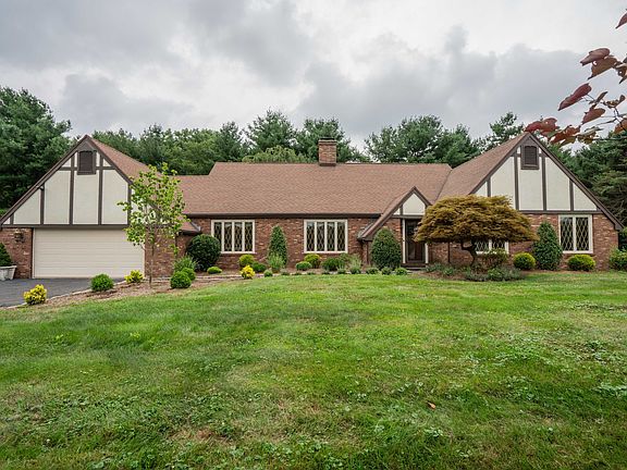 Discover the charm of Tudor-inspired elegance with this stunning Ranch home, set on a serene hill offering breathtaking views & spectacular sunsets. This residence seamlessly blends classic architectural beauty with modern luxury, beginning with its inviting facade featuring an ornate front door with leaded glass. The property boasts a desirable layout, including a spacious attached 2 car garage & a detached 1 car garage. Inside the home is adorned with detailed millwork, gleaming hardwood floors, & c/air for ultimate comfort. The open floor plan is anchored by a welcoming step-down living room, where a 2-sided fireplace serves as a central focal point, warming both the living & family rooms. The expansive family room impresses with a vaulted ceiling & skylights, leading to a stunning deck that overlooks a private backyard oasis. Here, you'll find a charming pergola, a graceful weeping cherry tree, & a cozy firepit area-perfect for relaxation & entertaining. The modern kitchen, open to the family room has a large peninsula for casual dining. Adjacent is a formal dining room bathed in natural light from picturesque Tudor-style windows. The luxurious primary suite offers ample closet space, a bathroom & sliders to the patio where you can savor serene moments under the pergola. Two additional bedrooms, currently utilized as offices, offer generous space & ample storage. Immaculately maintained, this home showcases unparalleled attention to detail & gracious appointments.