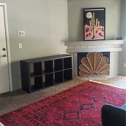 Separate dining areaCozy fireplaceFresh backsplashAdjacent balconyWhite cabinetsNewer stove and hood