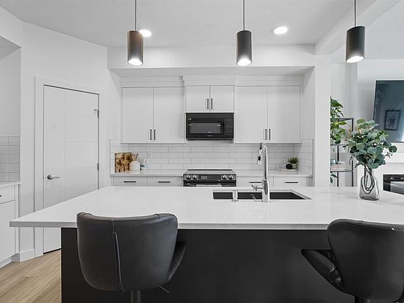 White and bright kitchenStainless steel appliancesQuartz countertopsGas rough-insAmple cabinetryModern electric fireplaceSun-soaked south-facing deck