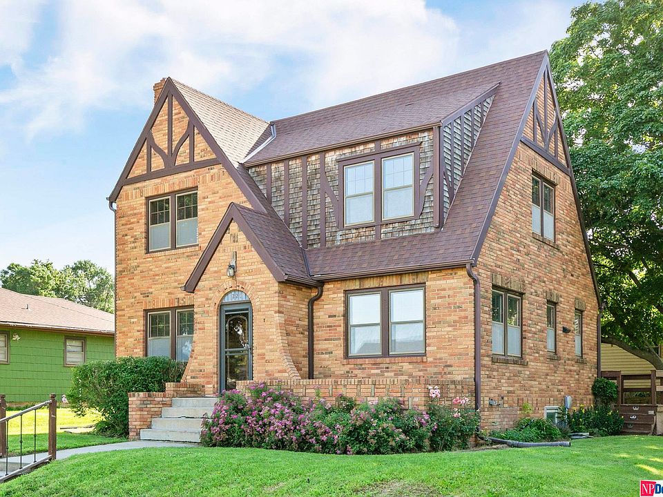 Beautiful All Brick Tudor Home in the heart of Dodge. This house is adorned w/ gorgeous wood floors. So much character is in this 1.5 Sty with original woodwork and doors throughout. Large family room open to dining room. Darling oak kitchen w/ appliances included. Main floor has a bedroom w/ wood floors & full bathroom. Large primary bedroom on 2nd floor w/ wood floors & walk in closets. 2nd floor has 2 other bedrooms with walk in closets & tons of windows. Fully finished basement with huge family room & wet bar. 5th bedroom & 3/4 bath in basement too. Oversized 2 car garage off alley in back. All brick shed stays. Big shaded deck. Sprinkler system. Enjoy small town living in this large turn of the 20th century home.