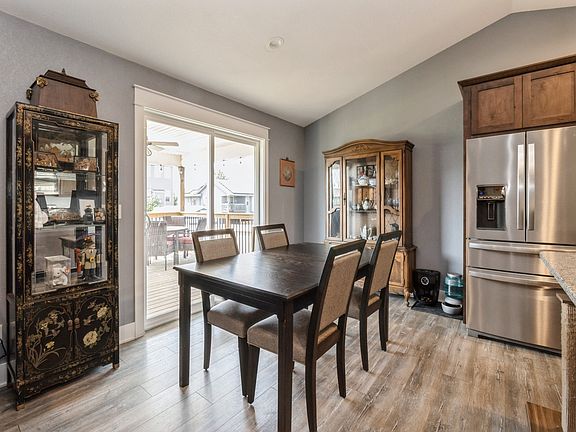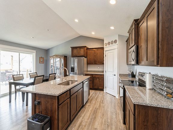 Beautiful custom built 5 bedroom, 3 bathroom ranch home with over 2700 sq ft of finish! Upon entry, your guests have a welcoming locker space to remove their shoes and hang a coat to stay awhile. The open concept kitchen / living space has a soaring ceiling, lots of cabinet storage, granite countertops, stainless steel appliances and a walk in pantry. A fireplace makes the large living space feel cozy and the dining area sliding doors lead to a 14 x 14 covered deck, patio space and fenced yard. Solar shades on the living room keep the summer heat out. The primary bedroom is ensuite with double vanity, a large tiled shower (with dual showerheads) and a walk-in closet. Two additional bedrooms share a full bath. The laundry room is on the main level and has direct access to the primary closet and an additional built-in locker area for your own family. The expansive lower level features 9 ft ceilings and the family room has a full wet bar for entertaining. The 4th and 5th bedrooms share a full bath. A 3 car attached garage completes this amazing home! Just steps from a great park.