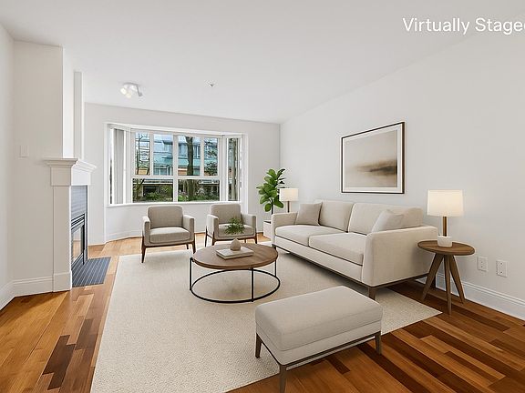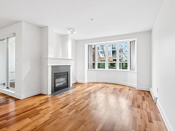 Gas fireplaceBay windowRenovated kitchenWhite cabinetsGranite countersCork floorsLarge primary suite