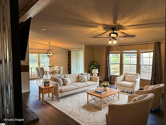 Make this 1.72-acre property with a spacious 3 bedroom, 2 bathroom mobile home your new retreat! Step onto the large front porch, partially covered, with a sliding glass door that opens into the dining room — the perfect spot to enjoy your morning coffee. Inside, you’ll find nearly 1,800 sq. ft. of living space with an open floor plan, featuring a generous living room, dining area, and a cozy gas log fireplace. A TV has even been left for the new owner to enjoy! The remodeled kitchen shines with stainless steel appliances, including a refrigerator, dishwasher, glass-top stove, and microwave. The laundry room includes a washer and dryer. Master Bedroom has a large ensuite bathroom with standing shower, garden tub, double sink and a generous walk in closet. 2 more bedrooms and second bath across the hall. Out back, a large deck is ideal for entertaining, while the property also offers a 2-car carport, a shed, plus a second shed on the opposite side of the lot for even more storage. Best of all, this is unrestricted property, so bring your farm animals and enjoy the freedom of country living. This home is being sold as-is.