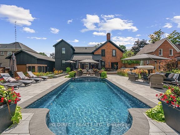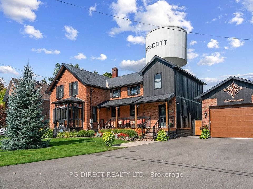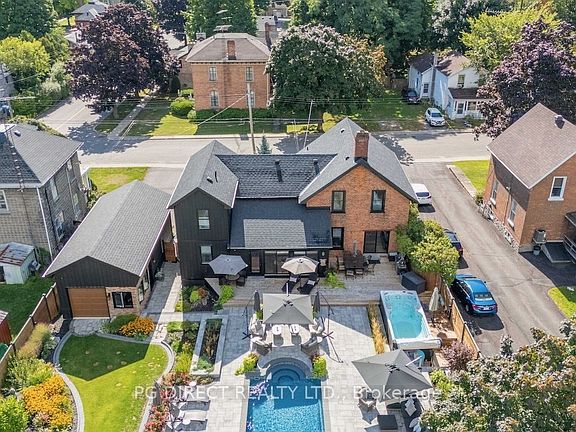 Visit the REALTOR website for further information about this listing Step back in time while enjoying modern comfort in this spectacular century home, a true time capsule brought back to life. Built in 1889, it showcases enduring craftsmanship, with double- and even triple-thick brick walls for beauty and durability. Set on a generous town lot in the heart of historic Prescott, you' re just blocks from the RiverWalk District, St. Lawrence River, schools, shopping, dining, and essential services. Commuters will value quick access to Highways 401/416, the US bridge, and an easy drive to Ottawa. Character abounds the moment you arrive. A paved driveway leads to a detached, oversized garage/workshop with convenient drive-through doors. Enter via the charming front vestibule or side mud/laundry room and feel at home. The main floor (approx. 1,425 sq. ft.) features original softwood flooring and a perfect blend of history and updates. The stunning kitchen boasts exposed brick, a working island, farmer' s sink, and custom bar. Flowing seamlessly, the bright family room offers a gas fireplace and double patio doors to the backyard. An expansive dining room and formal living room with its own patio doors to the BBQ area make entertaining effortless. A powder room completes this level. Upstairs, the 2020 addition enhances functionality and comfort. The primary suite offers a massive bedroom, spa-inspired ensuite with soaker tub and walk-in shower, and a large walk-in closet. Two more bedrooms plus a stylish 3-piece bath ensure space for family and guests. This floor provides approx. 1,144 sq. ft., for a total of 2,569 sq. ft. Out back, paradise awaits. Enjoy a swim spa, sports pool for volleyball, landscaped gardens, stonework, and covered gazebo. A bonus guesthouse retreat features cathedral wood ceilings, cozy bedroom, kitchenette, 2-piece bath, and outdoor shower ideal for visitors or private getaways.