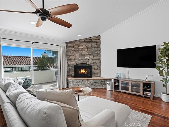 The main entry level features two bedrooms—including the primary suite—and two full ensuite baths. Head downstairs to find a third bedroom, although with no window, is spacious with it's own closet. This level also has direct access entry to the two-car garage with side-by-side washer and dryer hookups. Upstairs on the top floor, the open-concept living area is filled with natural light, vaulted ceilings, and a custom stone fireplace. The chef’s kitchen has been fully upgraded with custom cabinetry, granite counters, stainless steel appliances, and a breakfast bar. An effortless floor plan flowing seamlessly from the kitchen into the separate dining room and living spaces. From the top floor balcony, unwind and soak in the breeze while enjoying the city lights and peek-a-boo ocean views. With enough space for a bbq, this is effortless guest entertainment.