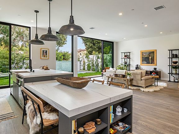 Immaculate, ground-up new construction in coveted Beverly Hills Proper. Timeless, architectural modern farmhouse custom-built with exclusive, high-end designer finishes. Meticulously designed, open floorplan features 13-ft vaulted ceilings and custom-made floor-to-ceiling sliders and French doors creating tremendous volume and scale. Formal Living and Dining rooms lead to expansive Family room and Chef's kitchen with high performance Neolith countertops and stainless steel appliances and beyond to grassy backyard, pool & spa. Luxurious Master Suite with walk-in closet, soaking tub and generous shower with herringbone detailing. Bright and airy with beautiful natural light and skylights throughout. Features unsparing collection of top-of-the-line materials including wide-plank European white oak wood flooring, Carrara marble, San Sebastian limestone, RH lighting and imported European cabinetry and plumbing fixtures. Conveniently located to downtown BH and WeHo. 5 bed, 4.5 bath.