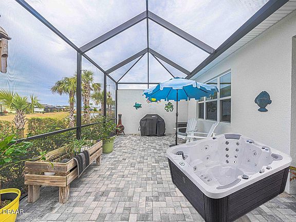 BRAND NEW HOT TUB INCLUDED! Fits perfectly on the lanai! As special as it's namesake, Latitudes Margaritaville offers maintenance free resort style living and an endless list of amenities unique in Daytona to only this development. This Lucia Villa is situated on a quiet, low traveled street with friendly neighbors and monthly get togethers. Its 5 o'clock somewhere! This sought after 55+ gated community is golf cart friendly and offers an Art and Learning Center, fitness/wellness center, pools, restaurant and bar, cabanas, tennis and access to resident owned beach club located beachside. This move-in ready home features two bedroom two bath , and oversized extended lanai. The 2 car garage includes a tandem 6x9 bump out specially sized to home a golf cart. It can also serve as additional storage, craft or hobby room. This property is light and bright with fresh neutral colors and boasts wood plank tile floors, crown molding, an open floor plan and split bedrooms. Open den adds additional light - this space could be converted to a 3rd bedroom! The kitchen was built with a gourmet chef in mind.
