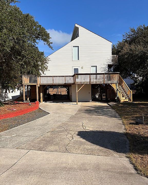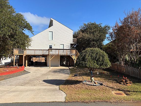 This is a 3 bedroom two story home on a quiet cul de sac in Kill Devil Hills. It features 1 full bathroom upstairs and a half bath downstairs. Open living room space with four large windows to allow for ample light. Two carpeted staircases lead up to the loft bedrooms. The kitchen features refrigerator, stove, and dishwasher with vinyl panel flooring. The HVAC system was replaced in 2024. The laundry room is furnished and there is a storage room that allows for tools, lawnmower, bicycles, and beach equipment. The surfboard shed easily accommodates 8 boards.