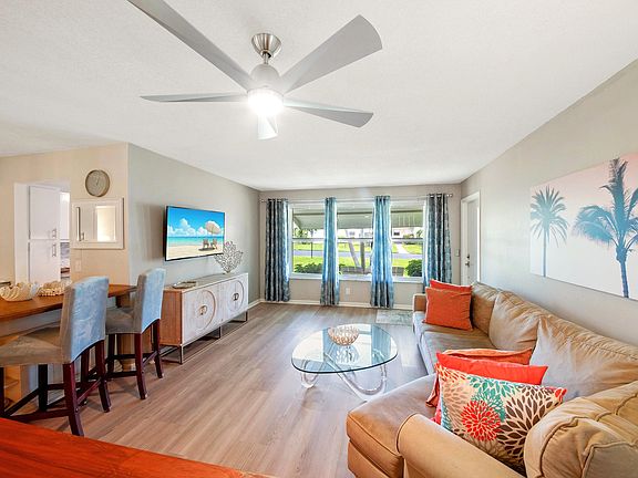 This beautifully updated villa, just 1 mile from the ocean, offers 1 Bedroom, 1.5 Bathrooms, Den, Florida room, and a bright open floor plan designed for today's lifestyle. The spacious layout flows seamlessly from the extended kitchen with wine bar into the living and dining areas, creating the perfect setting for entertaining or everyday living. Enjoy brand-new LVP flooring throughout and freshly painted interiors that make the home feel modern and move-in ready. The standout feature is the fully air-conditioned 128 sq. ft. (bonus sq ft) Florida room, showcasing wall-to-wall, floor-to-ceiling hurricane-impact windows and sliding glass door that seamlessly opens to the private patio--ideal for enjoying the Florida lifestyle year-round. Full hurricane-impact windows and doors throughout, provide beauty, peace of mind, and energy savings. Whether you're seeking a primary residence or seasonal retreat, this villa combines style, comfort, and location in one incredible package.