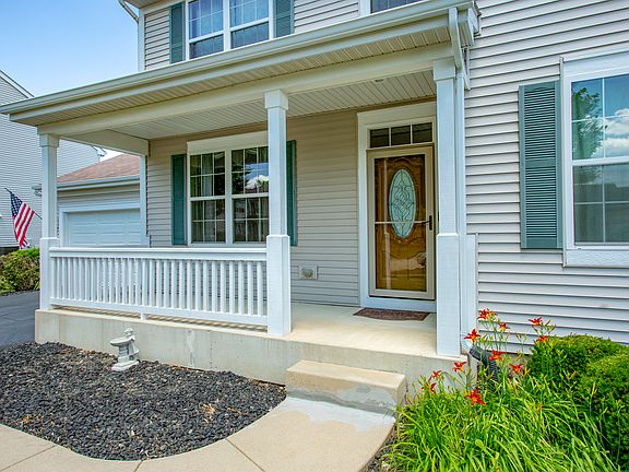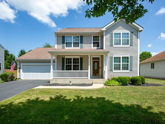 Welcome to this beautifully maintained two-story home offering 3,214 sq ft of spacious living, located just a short walk from serene ponds and scenic walking/biking trails. Enjoy the ultimate privacy with no neighbors behind you, providing peaceful and unobstructed views of your backyard.Relax on the inviting covered front porch-an ideal spot to unwind with your favorite drink while soaking in the fresh air and starlit skies. Step through the newer, insulated front door with its elegant oval glass inset, and you'll be greeted by stunning 3/4" oak hardwood floors that flow seamlessly throughout most of the main level.A private home office, complete with double glass doors, offers the perfect space for work or study. Just nearby, a freshly updated half bath features modern cabinetry, fresh paint, and a sleek new mirror. The formal dining room provides a sophisticated setting for entertaining, while the walk-through laundry room is equipped with a Maytag washer and dryer, ample cabinetry, and generous counter space for convenience.At the heart of the home, the open-concept kitchen and dining area create a warm and welcoming atmosphere. The kitchen boasts a large granite island with a breakfast bar, newer stainless steel appliances, abundant cabinetry, and elegant granite countertops. A window above the sink invites natural light, offering a serene view of your private backyard-no neighbors behind you means even more tranquility.The spacious living room is anchored by a beautiful stone gas fireplace with a classic wood mantel-perfect for cozy evenings spent indoors.Upstairs, a newly carpeted staircase leads to a bright landing, highlighted by a large picture window. The second floor includes five generously sized bedrooms, each with new carpeting. Both the primary suite and the second bedroom offer spacious walk-in closets. Both the hall bath and the primary ensuite have been thoughtfully updated with fresh paint, waterproof vinyl flooring, and new toilets.In 2025, a new water heater was installed, ensuring efficient comfort for years to come. The home also features a whole house water filter for added peace of mind and convenience. Additionally, a whole house electrical box surge protector (2023) was added in the basement for enhanced safety and protection of your home's electrical system.The unfinished basement offers an impressive 1,300 sq ft of potential, with two egress windows and endless possibilities for customization. The attached garage includes a tandem space-perfect for extra storage, a workshop, or parking for a third vehicle.If you're looking for a peaceful retreat with ample space, modern upgrades, and no neighbors behind you, this is the home you've been waiting for! This home is a short walking distance to the local high school too. This home is owned by a licensed Illinois Real Estate Broker.