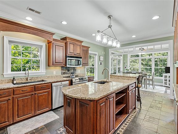 The fully finished walk-out basement provides a complete secondary living area, perfect for guests, kids or multi-generational living. It includes a second kitchen, open-concept living space, and a split-bedroom layout. It features newer LVP flooring throughout. The guest suite boasts a private bath and walk-in closet, while a third bedroom with a hall bath on the opposite side offers privacy and direct patio access, just steps from the pool.