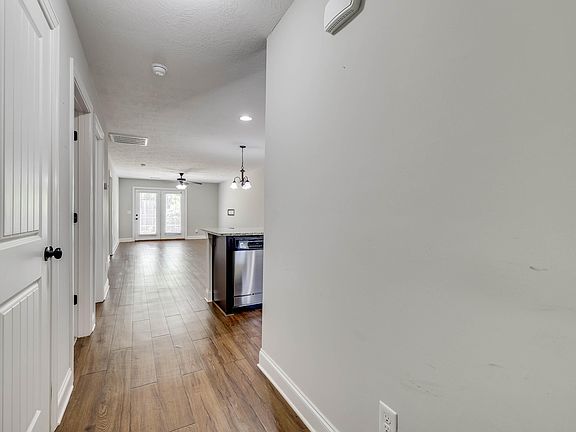 The open-concept layout features luxury vinyl plank flooring that flows seamlessly through the foyer, kitchen, living area, and guest bath. The kitchen is light and inviting with modern cabinetry, granite countertops, and stainless steel appliances—ideal for everyday cooking or entertaining.
