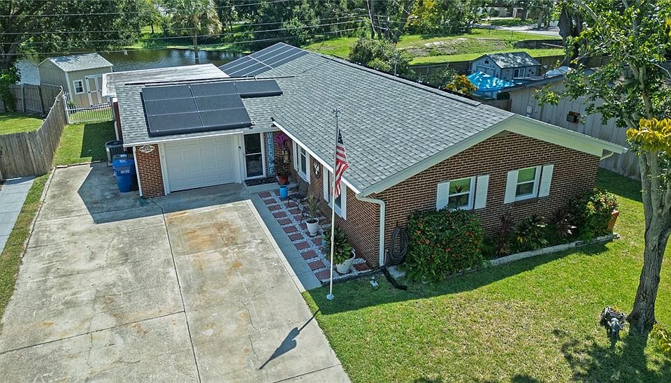 Welcome to this waterfront 3 bedroom block pool home that is filled with light, charm, and thoughtful updates. Its open floor plan features tasteful colors and quality materials, creating a welcoming space that flows beautifully from room to room. Everything was completely updated in 2021, the home features a newer roof, AC, electric, plumbing, and hurricane-proof windows, giving you peace of mind with no damage from previous storms. No flood insurance requested! Step outside to your private heated pool, resurfaced in 2022, with a screened and covered patio perfect for year-round enjoyment. Solar panels help reduce the electric bill, making it easy to keep the pool warm whenever you like. Inside, the kitchen flows into the living area with a quartz countertop, tile backsplash, dining counter for four, and recessed lighting that makes entertaining effortless. The master suite offers its own bathroom with a stylish grey-and-white tiled shower, while two additional bedrooms share a beautifully updated bath. A convenient inside laundry area (washer/dryer stay) with storage and a barn door adds extra charm. Motorized blinds on the back sliders provide effortless comfort. The home includes a garage, a reinforced shed securely tied down for added safety and an oversized driveway with space for an RV or boat! NO HOA. Surrounded by lush landscaping and a large yard, it feels like a private retreat, yet you’re just a short stroll to Central Park, where you can enjoy holiday fireworks, festive lights, and the amazing library. Centrally located, this move-in ready home is minutes from Highland Recreation Center, City Hall, shops, restaurants, and malls, only 19 miles to Tampa International Airport and 4 miles to the beach. Check out the virtual tour link below!