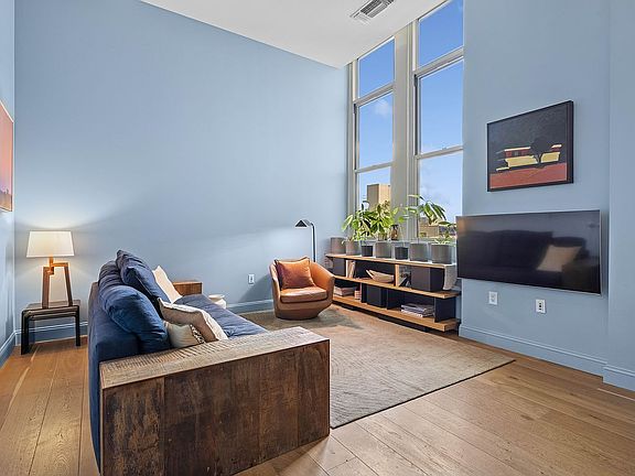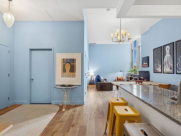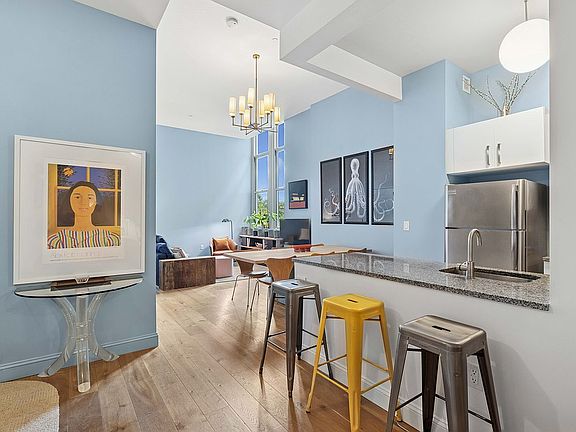 Soaring 12.5-foot ceilings create a sense of drama in this elegant studio residence at the landmarked P.S. 90 Condominium.