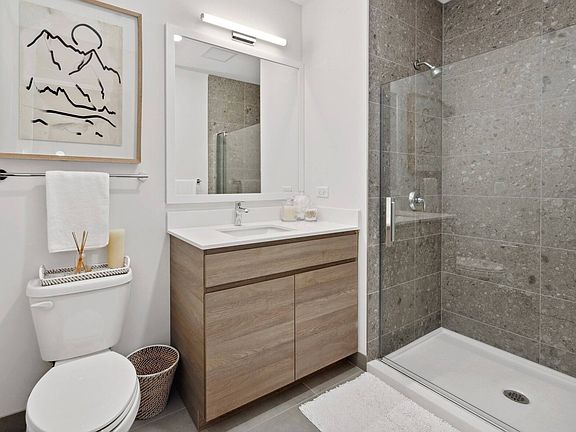Modern two-tone cabinetryHigh ceilingsContemporary spa-style bathFloor-to-ceiling windowsStunning skyline viewsPrivate balconiesIn-unit washer and dryer