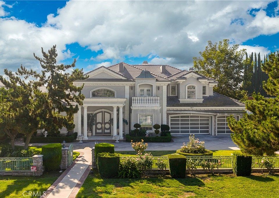 A grand double-door entrance opens to a dramatic foyer with soaring ceilings and a sparkling crystal chandelier. The home offers 6 spacious bedroom suites and 7 bathrooms, encompassing approximately 7,082 square feet of luxurious living space on a beautifully landscaped 20,079-square-foot lot. Elegant formal living and dining rooms, a private office/library, and a gourmet kitchen with a large center island and separate wok kitchen highlight both function and style. The main level features two bedroom suites, ideal for guests or multi-generational living.