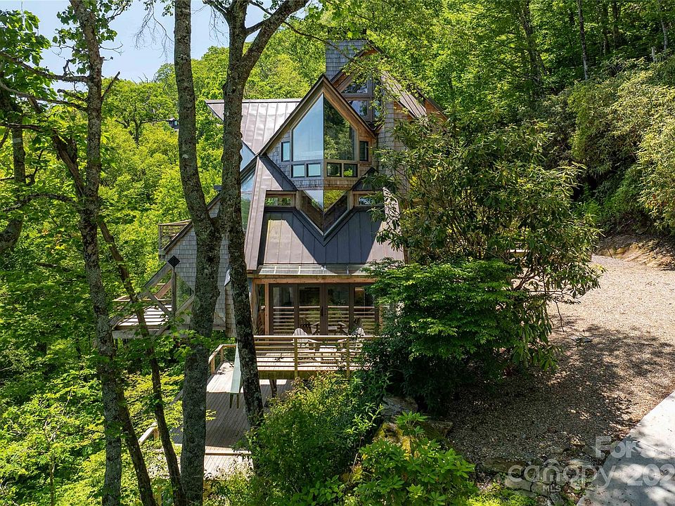 FOX DEN: This unique Jim Fox modernist design has just undergone a masterful, meticulous $1.5+ million renovation resulting in a modernized and sophisticated home. Updates include all systems, windows, siding, kitchen, baths, upgraded finishes throughout and landscaping. One of Fox’s most striking installations, the structural concept is based on 4 intersecting planes offering unique angles & glass throughout resting on the edge of Satulah Mountain at 4100ft elevation. The living room opens to stunning long-range views to nearby Whiteside, Chimneytop & Terrapin Mountains and the inward view is of Fox’s trademark organic stacked stone fireplace. The custom kitchen hosts Bosch and Fisher & Paykel paneled appliances, Caesarstone countertops & Rohl fixtures that accentuate Fox’s sleek cabinetry and skylight windows. Upstairs is the secluded primary suite with dueling triangular windows overlooking the forest and the en-suite bath has heated marble floors and a walk-in closet. An office or studio space completes the suite with a private loft perched above. Vertical windows create an open-air feeling as you traverse the floors. The lower level boasts a lounge with a MCM Brutalist fireplace & dry bar central to 3 large bedrooms, each with newly renovated en-suite bathrooms and private decks. The baths and powder room feature herringbone marble floors. Exit the lounge to a lower 1000 sq ft deck which displays the impressive architecture of the house’s cantilevered, diamond-design and can be used for a game court, play area, or as an outdoor entertainment area. This is a once-in-a-lifetime opportunity to own an architectural marvel on historic Satulah Mountain and one of the few in-town houses with long range views within walking distance to Main St. The recent updates and native landscaping ensure it will be a low-maintenance investment for years to come. Highlands, NC was ranked America’s Best Small Mountain Town by Travel & Leisure magazine in 2023.