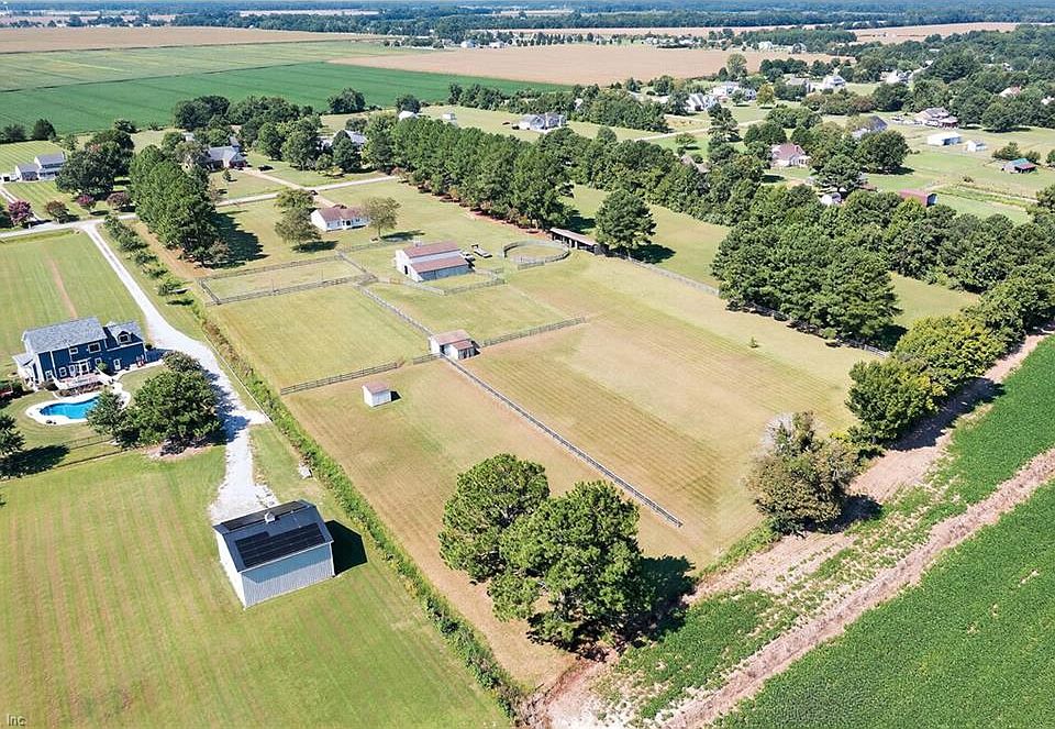 Charming 1982 ranch home with equestrian facilities on 9.705 acres in Chesapeake. The 1,575 sq ft home offers 4 bedrooms, 2 full baths, a primary suite w/ walk-in closet, eat-in kitchen w/ bay window & pantry, cathedral ceiling in living room, full laundry, mudroom & covered porch. Recent updates include windows (2022) & roof (2017). The property includes a 54'x48' barn w/ 7 stalls, air-conditioned tack room, wash/laundry, hot/cold water, storage loft w/ bath, plus a 70'x18' equipment shed. Riding amenities feature a 127'x70' lighted arena, 60' round pen, 3 run-in shelters w/ water & power, fenced pastures & paddocks. Sold as a package: 6.526 acres w/improvements + 3.179 acres cleared (total 9.705). Roof on barn replaced 2019. Designed for training, boarding or private enjoyment--this property blends function & charm for horse enthusiasts seeking country living minutes from city convenience.