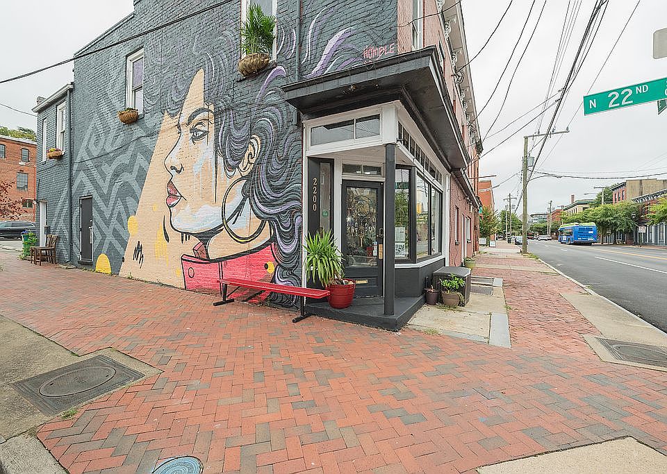 Adorning the side of this remarkable building is a striking mural painted by the talented professional muralist Humble. This artistic rendering of the word "Shockoe" adds a vibrant flair and celebrates the area's heritage, as the term originates from the Powhatan people, describing the sound of water flowing over rocks.