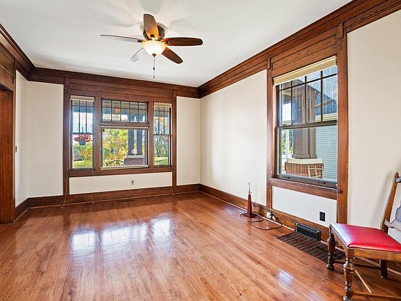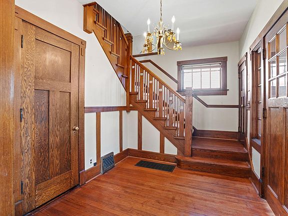Welcome Home to this Charming ''1915'' Historical 2-Story! The entry w/ vestibule and Arts and Crafts staircase warms your heart. Living and dining room boasts refinished HW floors, solid oak trim, boxed wood beamed ceiling, BI buffet, plate rail and beautiful leaded glass. A nearby den features an electric FP and more built-ins for those cold winter nights. An efficient, updated kitchen includes appliances, Corian counters, bar w/stools, recessed lighting and wood cabinetry. Upstairs is an option for 4 bedrooms or 3 w/ a nursery or dressing room. Sharp full bath /w linen closet. The LL is bright w/ a 1/2 bath, laundry, glass block windows and storage. New front & back doors, pretty landscaped yard, wood deck w/awning and front porch overlooking green space. 2.5 CG. An amazing property!