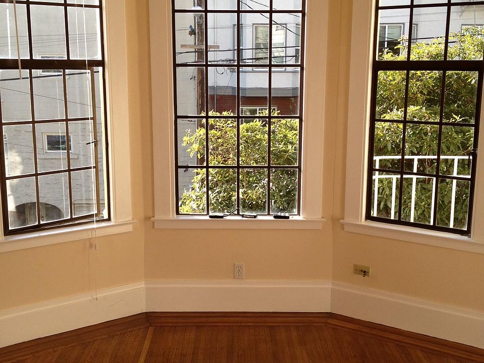 FALL SPECIAL: MOVE IN NOW AND GET ONE MONTH FREE Located on the second floor of a classic Victorian building at the corner of Green and Larkin, this newly remodeled rent-controlled studio exudes charm and boasts a 98 walk score & 92 transit score. Front door opens into vestibule before entering bright living room, which has a three-window bay facing west that affords direct, afternoon sunlight above a large tree, which creates a green privacy canopy. Beautiful refinished original hardwood floors throughout. Separate, eat-in kitchen has a vibrant, quartz counter-top, color-coordinated cabinet doors, ceramic tile floor and backsplash. You can eat at a bar-height (42") extension to the counter-top and gaze out at your view of Pacific Heights's eastern slope. Wheat colored walls contrast with white moldings and amber hardwood floor to produce a warm decorator look. Two closets. including one walk-in closet, with amazing storage shelves. Bathroom has a large window and shower over tub. Beautiful ornate white radiator provides steam heat. Conveniently located in the heart of Russian Hill steps away from Polk Street shops and restaurants, MUNI lines, and close to downtown and financial district. If you're new to S.F. or not familiar with this location, here's a more detailed run-down: The building is located one block west of Hyde Street, where the Hyde Street Cable Car runs north--south from Aquatic Park/Fisherman's Wharf to Powell & Market, stops one block away. The #41 trolley bus, which can take you west along Union Street, lined with up-scale boutiques, to the Presidio or east down to North Beach, with its vibrant nite-life, then south along Columbus Ave, adjacent to Chinatown, then through the Financial District via Montgomery Street, with Union Square close by, continuing on to Market Street and SOMA. Other, close-by attractions are: Ghirardelli Square, Fort Mason, The Marina Greens, Crissy Field, Fort Point and the Golden Gate Bridge to the west; Pier 39, The Embarcadero, Telegraph Hill, and Coit Tower to the east. Owner pays for garbage, water and heat. Tenant responsible for electric. Rent controlled, NON-smoking building. No pets. One year lease. Security deposit = 1 and 1/2 month's rent.
