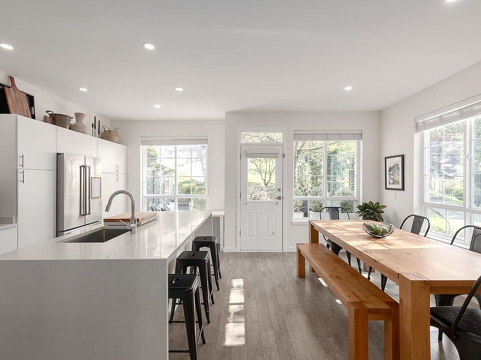 Rarely Available – a serene, park-like corner home offering fully renovated living in one of Port Moody’s most sought-after family communities. The main floor is ideal for entertaining, with morning light in the kitchen and private terrace, plus a south-facing balcony filling the living room with afternoon sun. Features include A/C, gas fireplace, custom built-ins, and extensive millwork. The dream kitchen boasts quartz counters, an oversized island, and custom cabinetry. Upstairs has 3 bedrooms and 2 baths, including a primary retreat with walk-in closet and spa-inspired ensuite. Downstairs, a large 4th bedroom with ensuite provides flexible space for guests, media, or rec room. 2-car heated garage, EV-ready. Easy access to schools, parks, trails, transit, this is the complete package!