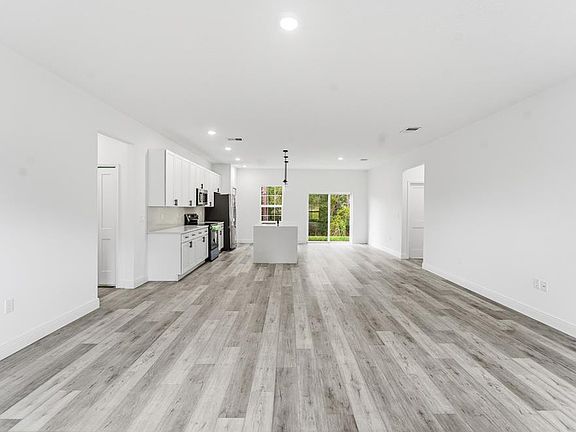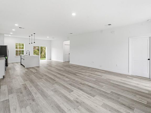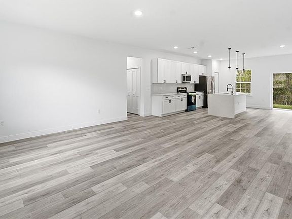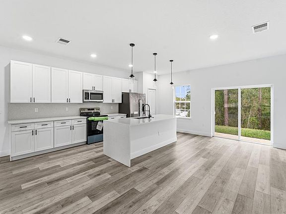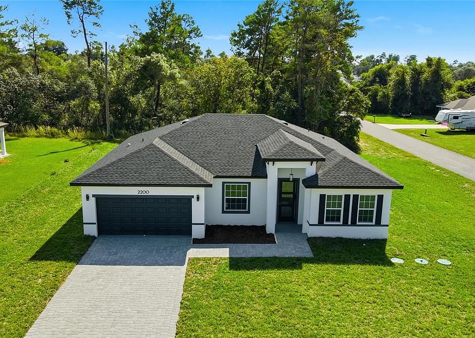 One or more photo(s) has been virtually staged. Welcome to this beautiful brand-new home with 4 bedrooms and 2 bathrooms, offering 1,774 square feet of modern space with an open-concept design and high-quality finishes. Located in the growing community of Marion Oaks, this home combines contemporary elegance with everyday functionality—perfect for families, investors, or anyone looking for a completely move-in-ready property. Upon entering, you are greeted by a spacious integrated living area with high ceilings, recessed lighting, and laminate flooring that extends throughout the home. The heart of the home is the charming gourmet kitchen, equipped with a large quartz island, stainless-steel appliances, shaker-style cabinets, quartz countertops and backsplash, hardware, and pendant lighting above the island. The open layout creates a seamless transition to the dining area and living room—ideal for entertaining friends and family. The primary suite offers a peaceful retreat with plenty of natural light and a private bathroom featuring dual quartz sinks, modern fixtures, framed mirrors, and a large shower with a tempered-glass door. Three additional bedrooms provide flexibility for guests, a home office, or room for a growing family. The beautiful guest bathroom includes a quartz vanity and a fully tiled tub/shower combo, also featuring elegant fixtures. Outside, the home showcases a modern clean-style façade with striking contrast, a covered front porch, and a wide paver driveway leading to the two-car garage. Sliding glass doors open to a tranquil backyard bordered by wooded surroundings that ensure privacy—perfect for creating your dream outdoor space. This newly completed home offers all the benefits of 2025 construction, including energy efficiency, low maintenance, and the peace of mind that comes with owning a completely new property. Located just minutes from shops, schools, recreation areas, and major roads, this residence offers style, convenience, and comfort all in one package. Don’t miss the opportunity to own this incredible new home—schedule your showing today!