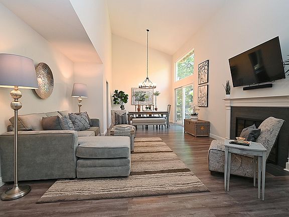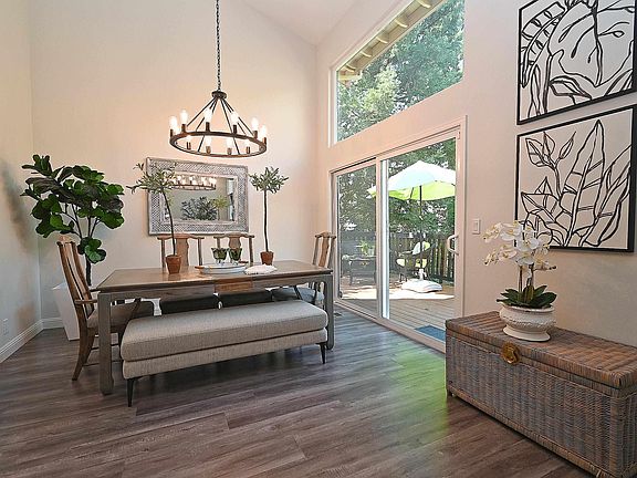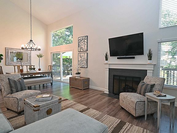 Rarely available end unit townhome on a court, backing to creek and mature trees in Rudgear Estates. The light filled living /dining room features high ceilings overlooking the expansive deck. Engineered hardwood, updated baths, kitchen with stainless steel appliances & refrigerator is included. Separate nook adjacent to family room with second fireplace. Primary suite and secondary bedroom feature Elfa closet organizers. Third bedroom has a walk-in closet. Skylights upstairs plus a remote-controlled whole house ceiling fan for energy conservation. Just a few blocks from Rudgear Park with play structures, basketball, pickleball, tennis, pool and kids pool. Freshly painted. Epoxy garage floors, 2 zone heating/cooling. Ample visitor parking. This is a real knockout. Open Sat./Sun. 7/20-7/21. 1-4pm. Reports/Disclosures posted.