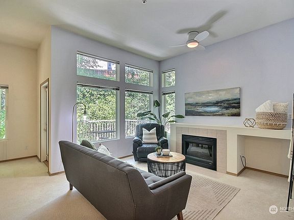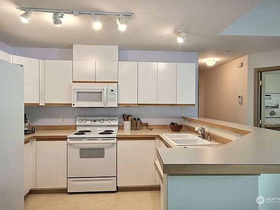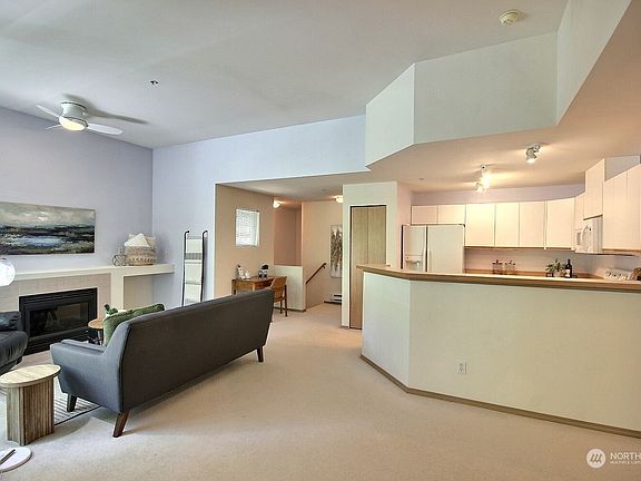 Welcome to this upper-floor end unit condo in the Riverview community, backing up to a peaceful greenbelt. The main living area features high ceilings & an open floor plan w/ abundant natural light, complemented by a cozy fireplace & dining space. The kitchen offers plenty of storage, light cabinetry, & all appliances are included. The primary bedroom has an attached bathroom & walk-in closet. French doors lead to a sizable 2nd bedroom. Private generous sized balcony overlooks the greenbelt. Enjoy the pristine grounds and the complex’s 2 playgrounds. The condo includes an attached garage & ample guest parking. Conveniently located near shopping, restaurants, SeaTac Airport, & w/ easy access to I-5, 167, & 405. Don’t miss out on this one!