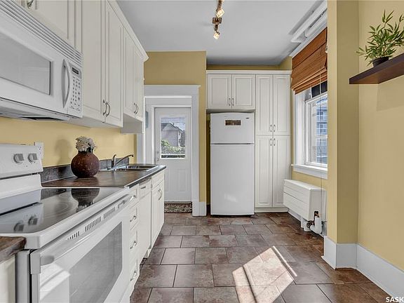 Welcome to this charming corner-unit condo located in the historic Bartleman Apartments, right in the heart of Regina’s downtown. Step inside to an open-concept living and dining area where extra windows unique to the corner location fill the space with natural light, highlighting high ceilings and timeless details like original trim, tall baseboards, and classic doors. The space is anchored by a decorative fireplace and finished with cork flooring, adding both warmth and character. An archway leads to the kitchen and secondary bedroom, creating a beautiful flow between rooms. The bright white kitchen is tucked just off the main living space and offers plenty of cabinetry, counter space, and tiled flooring with room to add a coffee bar or buffet if desired, making it both functional and inviting. A garden door extends the living space outdoors to a patio surrounded by greenery, an ideal spot to enjoy your morning coffee or unwind at the end of the day. The primary bedroom offers plenty of room for a king-sized bedroom set and sits adjacent to the 4-piece bathroom. The bathroom features tiled flooring, a tiled shower/tub combo, a storage unit, and a convenient second entry from the main living area. A secondary bedroom off the main living area is complete with a beautiful chandelier and can serve as a home office, reading nook, or guest bedroom with the addition of a wardrobe. Parking is simple with one dedicated stall steps from the back entrance, plus plenty of street parking for guests. What makes this condo especially appealing is the lifestyle it offers. For downtown professionals, the location means you can walk to the office, stop at your favourite café, or head out to dinner without ever needing to drive. Wascana Park, The Museum, local favourites like Tangerine, Fireside Bistro, Niche Yoga & Therapy, and Leo’s OG, plus the many shops along 13th Avenue, are all within walking distance. Move-in ready with quick possession available.