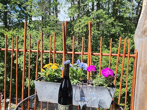 Redwood kitchen islandSurrounded by mountainsSpacious master suiteLarge bathtubDining room tableLarge outdoor deck