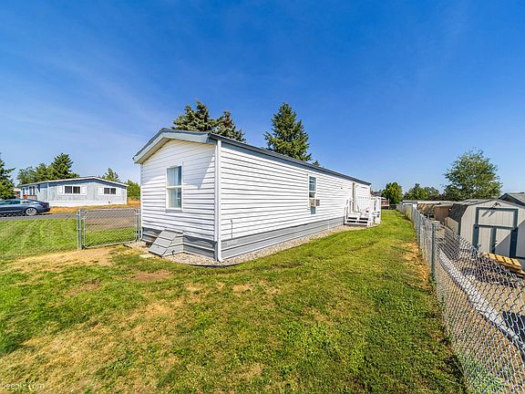 Great 2 bed/1 bath 1994 Liberty manufactured home located less than 20 minutes from Downtown Spokane in the Cheney School District. This home sits parallel to the road allowing for a larger lot than most in the park. Featuring fresh interior paint, a large kitchen with pantry, all appliances included, and a primary bedroom with extra large double closets, fenced yard, and sprinkler system. Seamless gutters and skirting were new in 2016. You'll find West Plains Village is well kept and includes a 24 hr gym and reservable community hall.