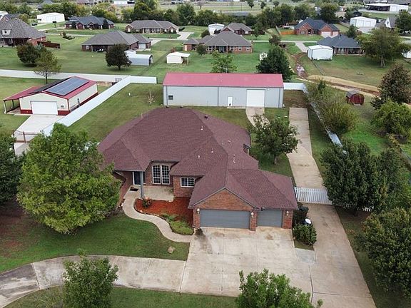 Welcome to your "Home Sweet Home" nestled on a sprawling FULL acre in the peaceful community of Lost Creek. This gem, centrally located in the heart of Moore, offers an impressive 4 bedrooms, 3 bathrooms, and an astounding 80x40 shop for all your dreams and hobbies! Upon entry, you'll be greeted by fresh paint, new carpet, and gleaming hard floors, setting the stage for a captivating dining room adorned with a tray ceiling. This home is ADA compliant, boasting wider doorways, a roll-up front door, and a roll-in master shower for ultimate accessibility. Discover a second master bedroom, thoughtfully isolated from the rest of the home, making it an ideal Mother-In-Law suite. Abundant natural light and a cozy fireplace create the perfect ambiance for hosting guests. The kitchen, a chef's dream, features charming real brick accents, a built-in oven, a convenient built-in desk, and an abundance of counter space. This true split floor plan ensures privacy, with secondary bedrooms sharing a Jack-and-Jill bath. The master suite impresses with dual sinks, an expansive walk-in shower, and a spacious walk-in closet. Your peace of mind is further ensured with an interior safe room. But the true standout is the massive 80x40 shop, equipped with a half bath and electric service. It's a one-of-a-kind property that's just waiting for you to make it your own! Don't miss out on this exceptional opportunity to call it "Home!"
