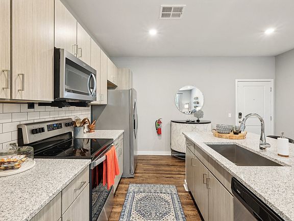 - Exterior features: $0 Deposit, 9 Foot Chef's Island in Kitchen, BBQ/Picnic Area, Business Center, Courtyard, Custom Cabinetry, Detached Garages Available, Elevators, Flex Rent, Flooring: Wood, Game Room, Granite Countertops, Hi-Speed Wi-Fi Included, High Ceilings, Outdoor Fire Pits, Package Receiving, Pet Park, Putting Green, Resident Rewards Program, Self Guided Tours, Short Term Lease, Side-by-Side Refrigerators with Water Dispenser, Stainless-Steel Appliances, Sundeck, TV Lounge, USB Outlet, View Type: Courtyard/Pool/Pond View*, White Subway Tile Backsplash, Wine Coolers*