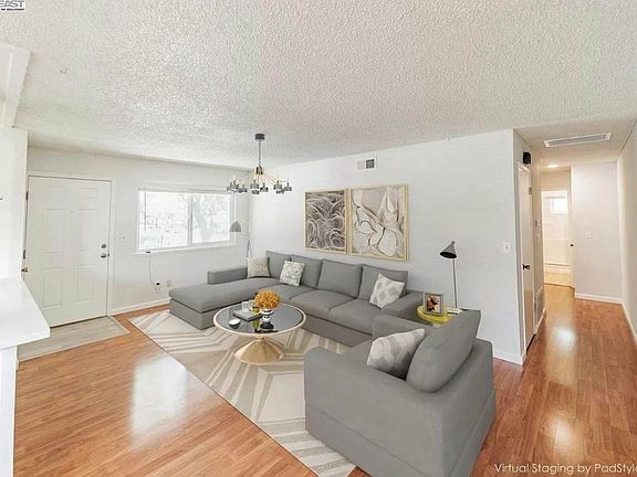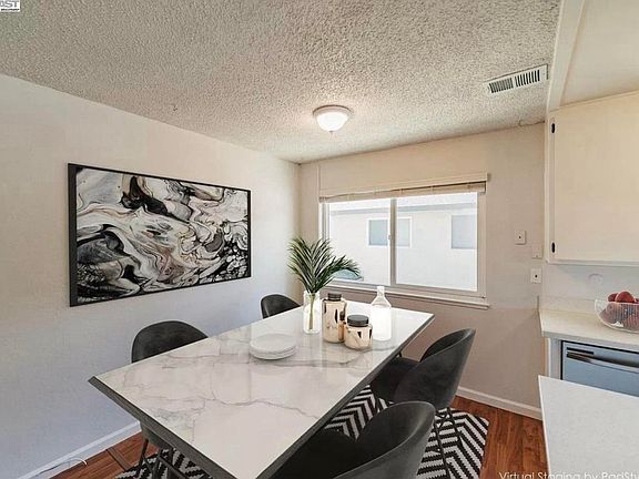 Lowest priced property in the Tri-Cities! Great opportunity for stunning one level two bedroom condo in Downtown Estates neighborhood of Union City. No rental restrictions. Situated on the second floor and updated in 2020, this unit features a fully equipped kitchen with quartz countertops and stainless steel appliances, including refrigerator and attractive convertible island mount range hood, updated bathroom with beautiful tempered glass sink, white vanity, multipurpose medicine chest and spacious stall shower, spacious living room, dining area off kitchen, fresh paint throughout, laminate floors, dual pane windows, window blinds, forced air heating, whole house fan and ample storage with coat closet, hall closet and linen closet. One carport space, additional tandem parking space, two storage closets and convenient community laundry downstairs. Low monthly HOA dues, only $385 per month, include water, sewer, hot water, trash removal and HOA amenities including two swimming pools and clubhouse. Ideal commute location, close to Union City BART and easy access to 84 and 880. Open House, 10/26 & 10/27, 1:00 – 4:00 PM.