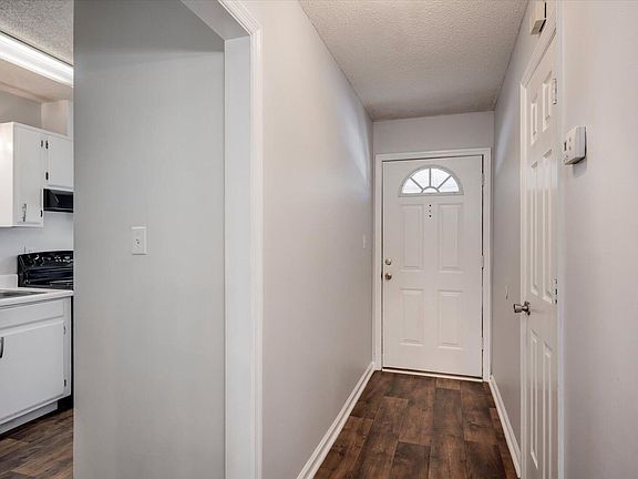 Step inside to an inviting entryway, complete with a coat and storage closet to your left. To your right, you'll find a bright kitchen featuring fresh white cabinetry, matching appliances, a pantry, and a laundry closet — everything you need within easy reach. The kitchen seamlessly opens into the spacious dining and living areas, both featuring stylish wood-look flooring that flows throughout the common spaces.