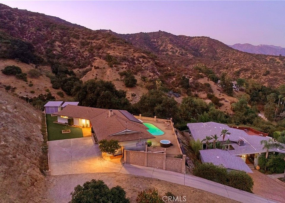 The rear yard enjoys a large pool and pool deck taking in the mountainous views in all directions. There are also generous play yards, pampered gardens, and two “sheds” that were most recently used for painting and art storage. Just a few of the features include: updated copper plumbing, upgraded HVAC, a newer roof and solar panels, and an attached two-car garage with its own half bath.
