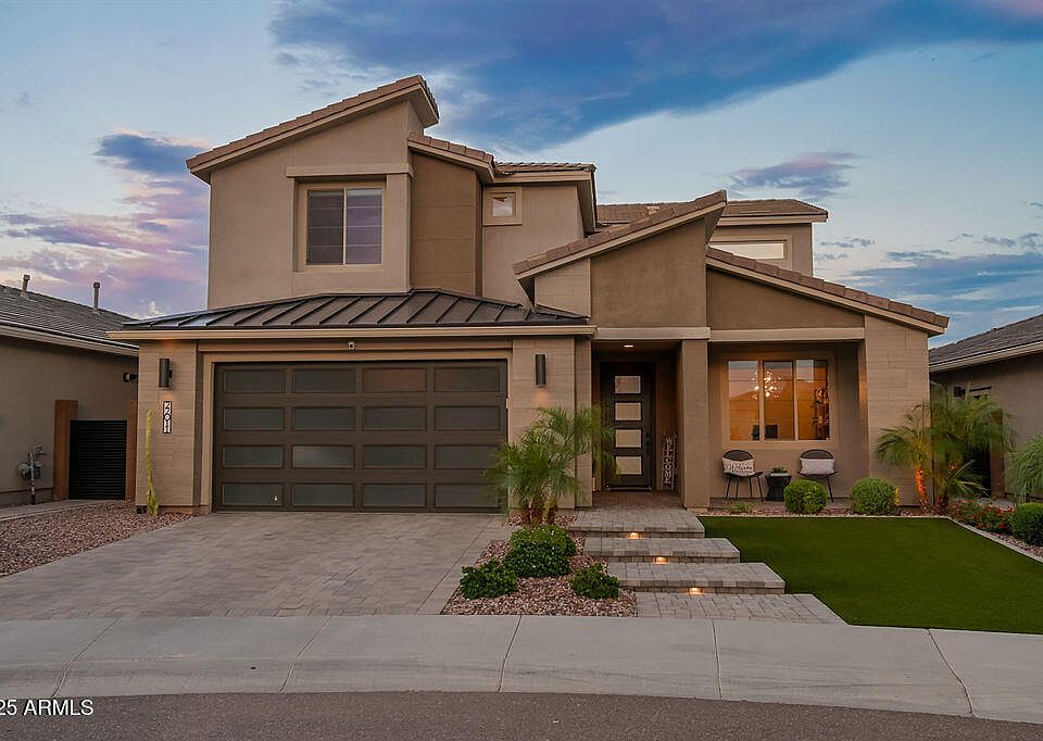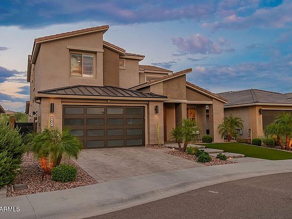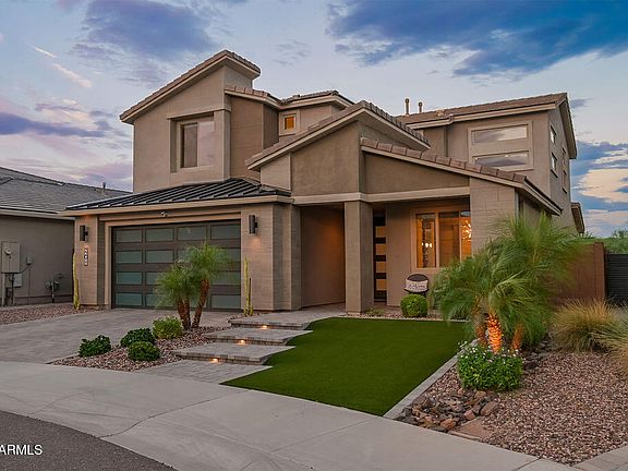 Welcome to this exquisite Prato floor plan in North Phoenix's most highly sought-after community of Sky Crossing. This residence offers 4 bedrooms, 3.5 bathrooms, a 3-car garage, and a main-level primary suite, all set on a premium lot with mountain views and a view fence. From the moment you enter, you'll notice the thoughtful upgrades throughout—over $300,000 in total enhancements. The gourmet chef's kitchen is a true showstopper with an upgraded appliance package that includes a Wolf dual-fuel range with infrared griddle, Bosch refrigerator, wine fridge, double ovens, quartz waterfall island, expanded cabinetry with beverage fridge and shelving, and shaker cabinets with upgraded hardware. Custom touches continue with a granite farmhouse sink, upgraded vent hood, and under-cabinet lighting. The family room impresses with soaring 20-foot ceilings, a custom built-in media wall with Sonos sound system, fireplace, cabinetry, and upgraded corner sliding doors that open seamlessly to the outdoors. Other thoughtful touches include French doors to the office, barn door in the primary bath, expanded bay windows, accent shiplap walls, wallpaper details, upgraded lighting fixtures, upgraded flooring and carpet, and a Ring security system. Your outdoor retreat rivals a luxury resort with a covered travertine patio with outdoor electric shades that enclose the patio, seamlessly transforming it into an additional outdoor living room, custom-designed pool and spa, fire features, built-in grill, Green Egg, fire pit, travertine tile, electric shade enclosures, and upgraded outdoor lighting. Practical upgrades abound, including a washer and dryer, epoxy garage flooring, upgraded front and garage doors, recessed lighting package, and extended master shower with upgraded tile and glass. An upstairs guest suite with its own private bath and walk-in closet completes this highly functional floor plan. Located in Sky Crossing, North Phoenix's most desirable community, this home is just steps from Sky Crossing Elementary, six community parks, fitness center, heated resort-style pool, splash pads, walking trails, state-of-the-art community center and more!