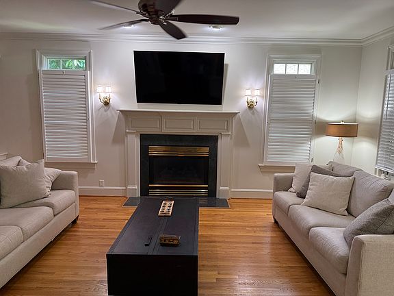 * Spacious, light-filled living area with hardwood floors, crown molding, and a cozy fireplace