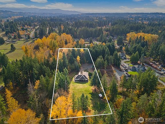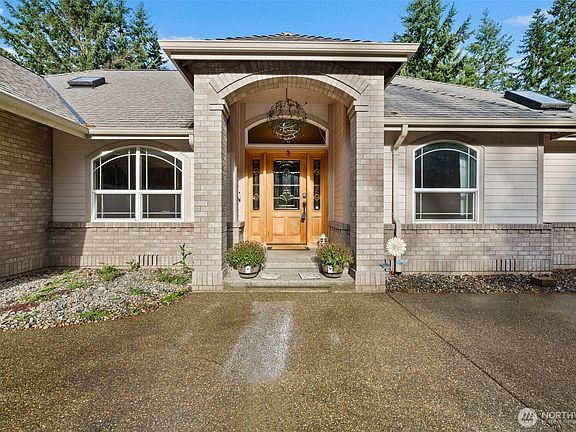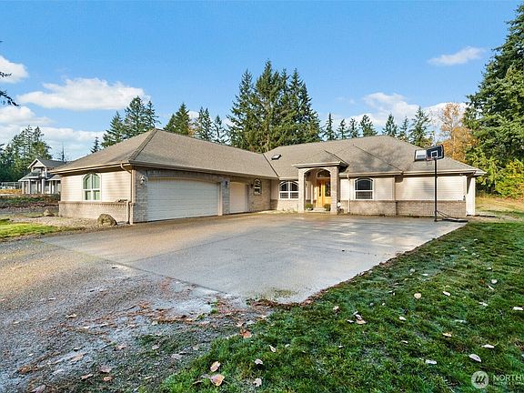 Escape to this private retreat on over 4 acres w/ this well-maintained rambler offering 3 bedrooms, 2 baths, and TWO versatile offices/flex rooms—ideal for remote work or hobbies. Enjoy spacious single-level living w/ a wide-open great room, hardwood floors, & a cozy wood-burning stove framed by large windows overlooking serene wooded surroundings. The kitchen features a large island, solid cabinetry, & newer appliances. The primary suite includes a spa-style bath w/ tiled walk-in shower, jetted tub, dual vanities, & a generous walk-in closet. Outdoors, enjoy the covered patio, large dog run, usable acreage, detached outbuilding, & room for gardens, animals, or a future shop. Bonus: direct back-road access to Bonney Lake with total privacy.