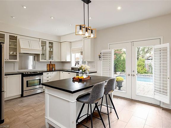 This elegant custom 'Markay' built 5+1 bedroom, 4-bathroom luxury home with a newly finished basement is located in Westmount, one of Oakville’s most desirable family-friendly communities and excellent street! Steps from top-ranked Garth Webb High School, scenic parks, and endless trails, this prime location also offers quick access to Abbey Plaza, Glen Abbey Community Centre, Oakville Hospital, and major highways (407, QEW/403) within minutes. Featuring striking curb appeal with a brick and stone façade, mature landscaping, inground sprinklers in front yard, and a private backyard oasis with a saltwater pool, stone patio, evergreens, landscape lighting, and built in outdoor speakers, this home is perfect for entertaining and family living. Inside, sophistication shines with 9-foot ceilings, hardwood floors, pot lights, California shutters, custom wall mouldings and feature walls, and stylishly updated bathrooms. The sun-filled living room with a gas fireplace, formal dining room, and main floor office enhance functionality. The dream kitchen boasts white cabinetry, granite counters, an island with a breakfast bar, stainless steel appliances, and garden doors opening to the backyard paradise. Upstairs offers a spacious family room, five bedrooms, and two modern baths, including a luxurious primary suite with a walk-in closet, soaker tub, and glass shower. The newly completed basement (2025) provides versatile living with a large rec room with a fireplace, second kitchen, office/playroom, sixth bedroom, 3-piece bath, and a second laundry room—ideal as an in-law suite. Additional upgrades include some new windows and a reshingled roof (2016), pool pump, liner and refurbished filter (2021), Bosch security system, and more, making this Oakville real estate gem move-in ready.